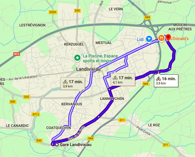 Morlaix 20 minutes • Brest 35 minutes • Quimper 58 minutes • Gourin 1h06 • Lorient 1h35 • Saint-Brieuc 1h15 • Loudéac 1h40 • Nantes 3h28 • Rennes 2h20 • Doville 3h50 • Fougères 2h46 • Tours 4h45 • La Rochelle 5h04 • Vicq-sur-Gartempe 5h40 • Paris 5h55 • Lille 7h24 • Toulouse 8h47 • Leuven 8h47 • Marseille 12h30